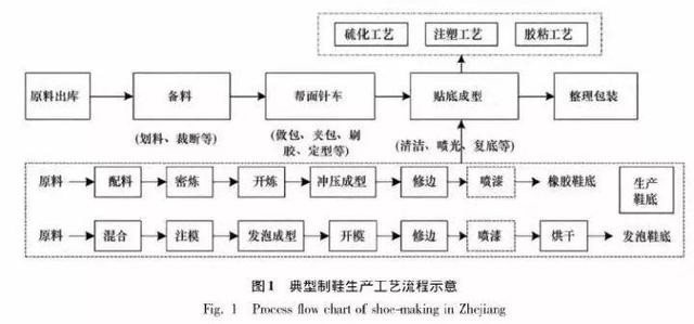 在國內眾多的鞋廠中,采用的原輔料是牛皮、人造皮、布類、鞋底、鞋內里、膠水、鞋帶、鞋用五金以及包裝材料等,其工序為裁斷、縫合、涂膠、前綁、后綁、壓底、烘干、定型、脫楦、包裝等工藝,生產能力可以達到年產400萬雙運動鞋。